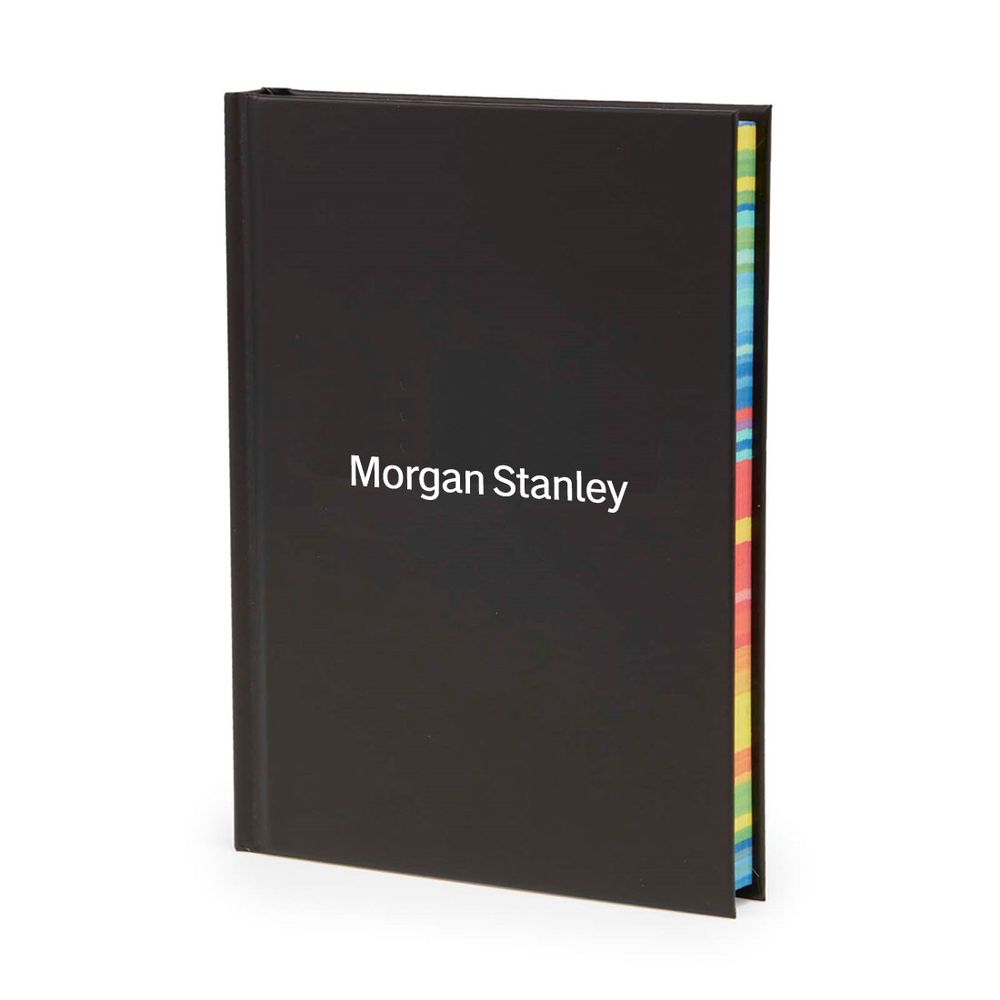 Hard bound notebook with approximately 128 rainbow-edge lined sheets (not refillable). Hard bound chipboard cover and ribbon bookmark. 4 1/2" W x 5 3/4" H. Features the Morgan Stanley logo.