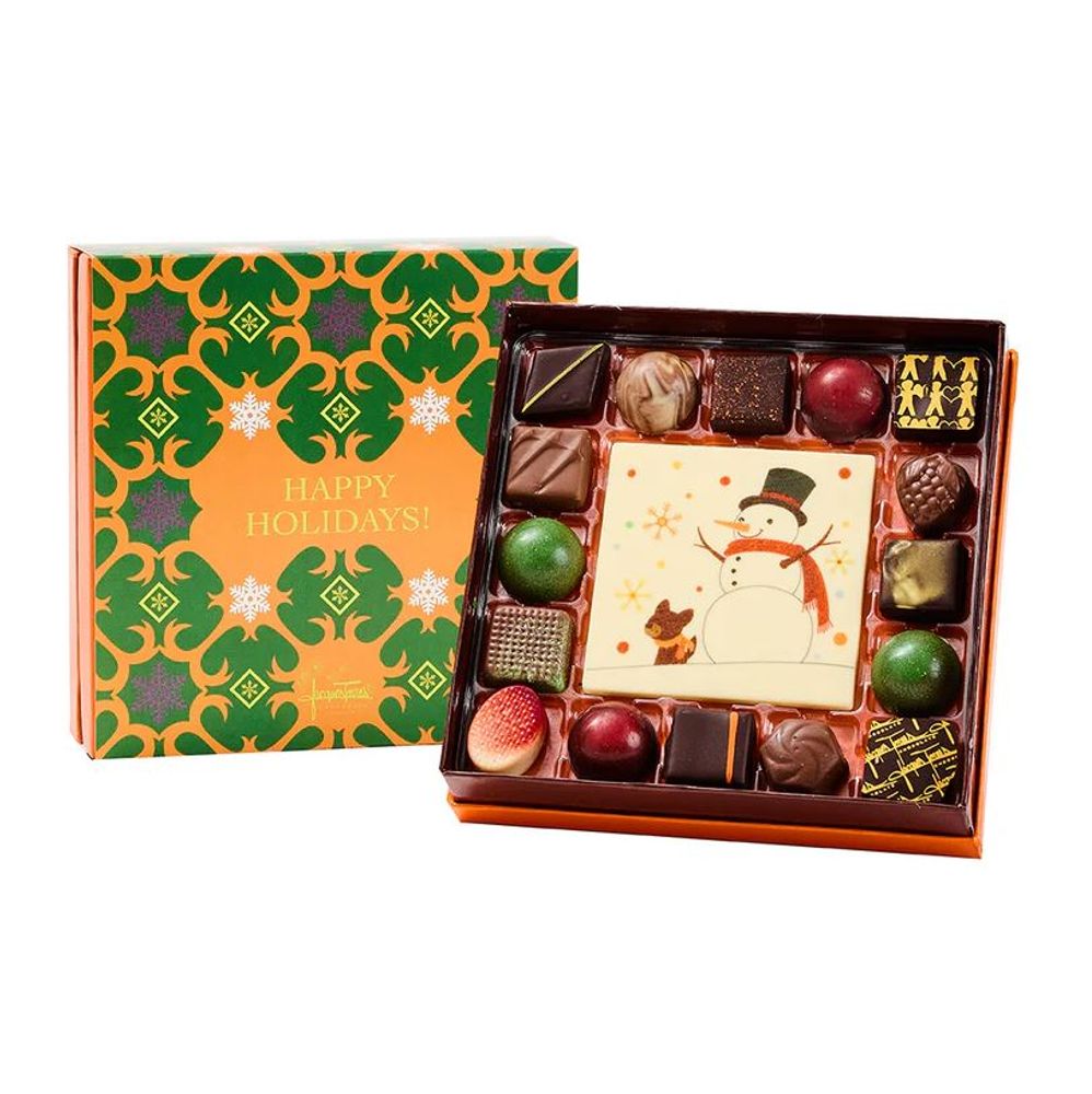 Celebrate the holidays with these cheery snowman enjoying a Winter Wonderland! The limited edition holiday flavors and favorite assorted bonbons surround the printed edible smooth white Belgian chocolate center plaque. 16 pieces. Happy Holidays sleeve included. The actual selection of bonbon flavors may vary from those pictured here.