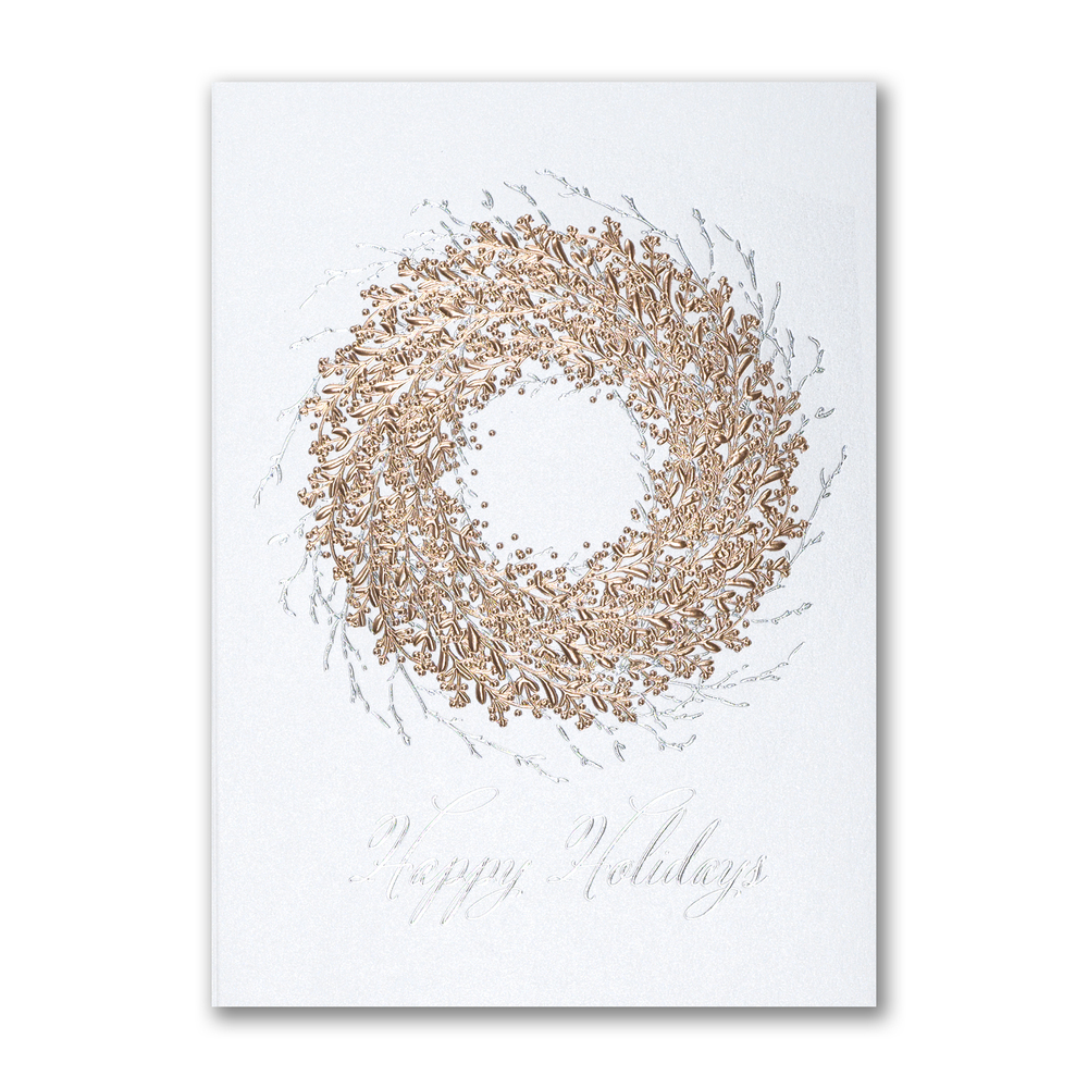 A shimmering wreath made of rose gold foil with delight the hearts of all those you send this holiday card to. Made from recycled paper by manufacturers using renewable energy sources. Dimensions: 5 5/8" x 7 7/8" Folded. Foil stamped printing. Price includes printed card with blank envelope (silver-lined white). Morgan Stanley logo inside the card.