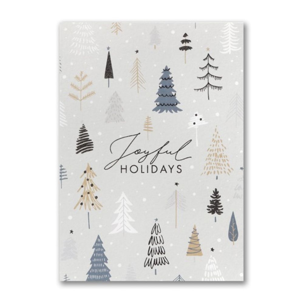 Whimsical trees in shades of blue and gold are trimmed with raised, textured ink and scattered over the front of this charming holiday card. Dimensions: 5" x 7" Folded. Price includes printed card with blank lined envelope (gold-lined white). Paper: White Vellum 94 lb. Morgan Stanley logo inside the card.